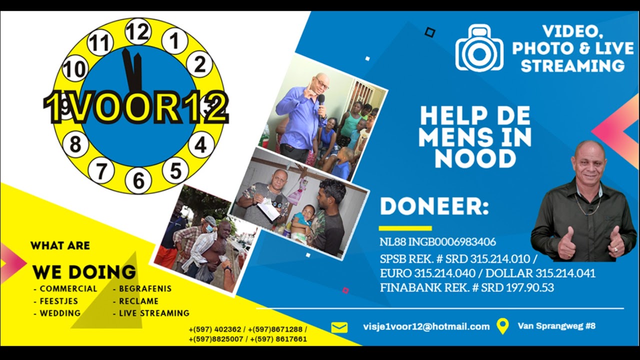 Stichting 1 VOOR 12 is een bekendheid in de Surinaamse samenleving, maar ook ver daarbuiten. Onvermoeibaar blijven de betrokken, maar ook de grote en kleinere donateurs een positieve bijdrage leveren aan de mens in nood binnen de samenleving. Stichting 1 VOOR 12 draagt bij aan de zorg voor duurzame verbetering van de leefomstandigheden van sociaal zwakkeren in Suriname en verlicht zo de zware taak van de overheid. Voor meer info of een donatie maak contact op één van de nummers op de bovenstaande info flyer.