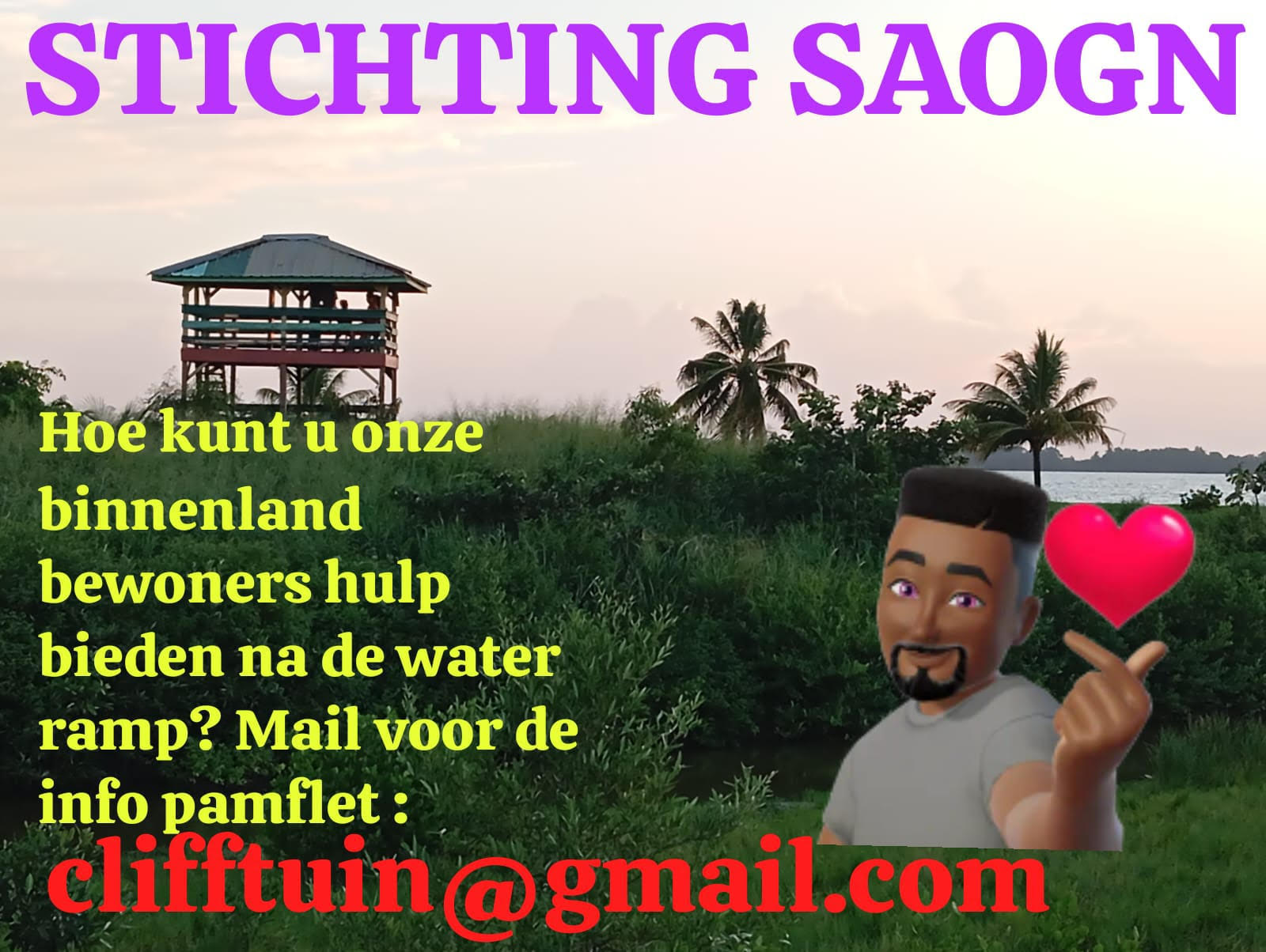 SAOGN staat voor : Sociale en Agrarische Ontwikkeling Gakaba en Nieuwkampoe. Wilt u een bijzondere bijdrage leveren aan de ontwikkeling van onze binnenlandbewoners na de overstromingen die hun hebben gedwongen naar hoger gelegen land te verhuizen? Stuur ons een WhatsApp of email en lees meer in de info pamflet.